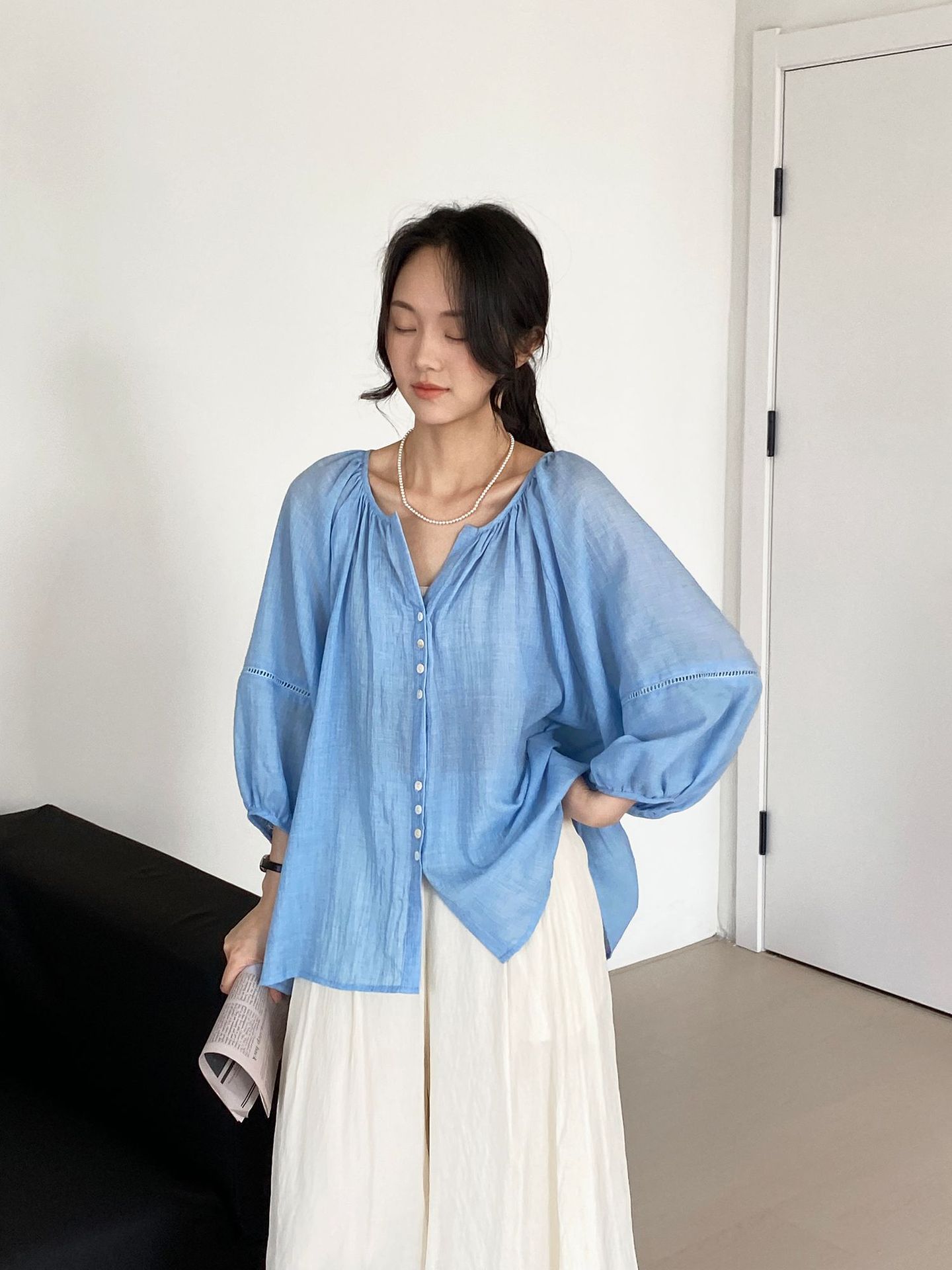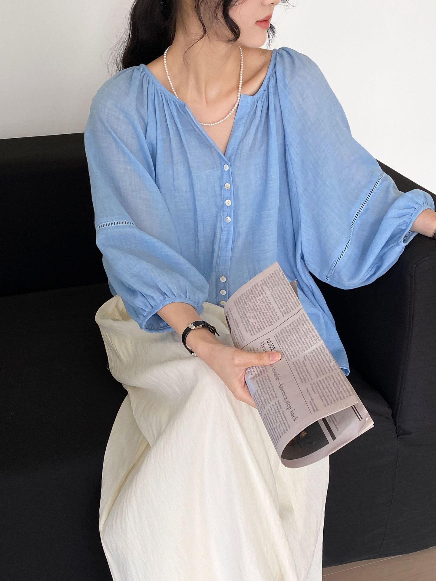 Lightweight And Comfortable Pleated Shirt V-neck Lantern Sleeve Loose