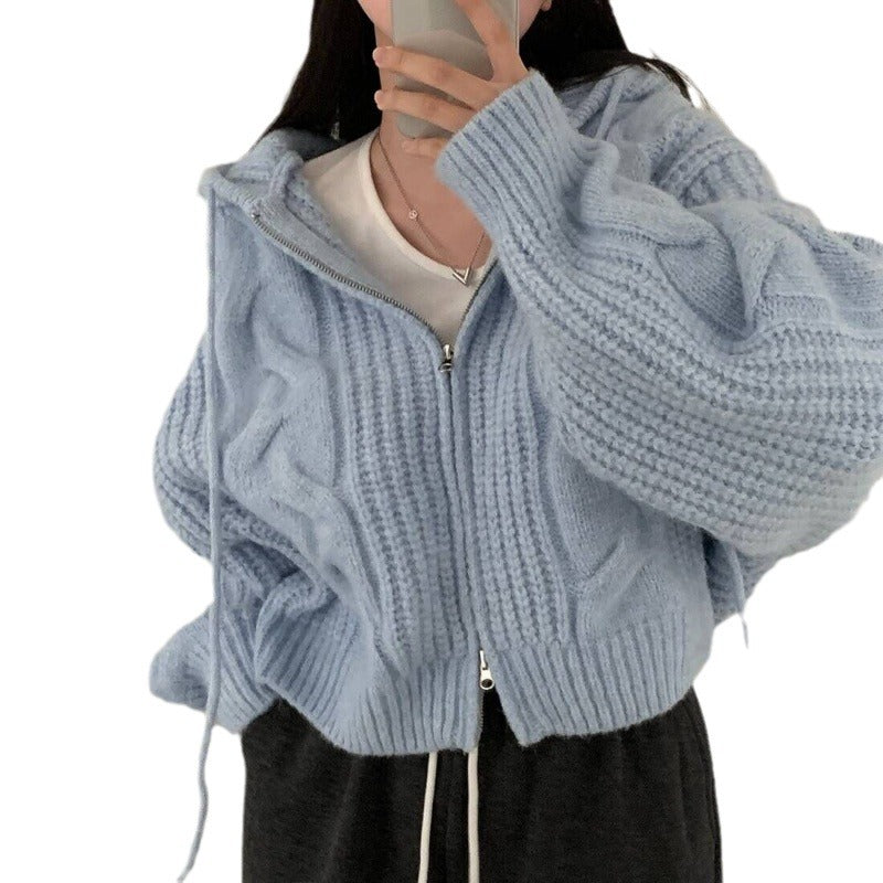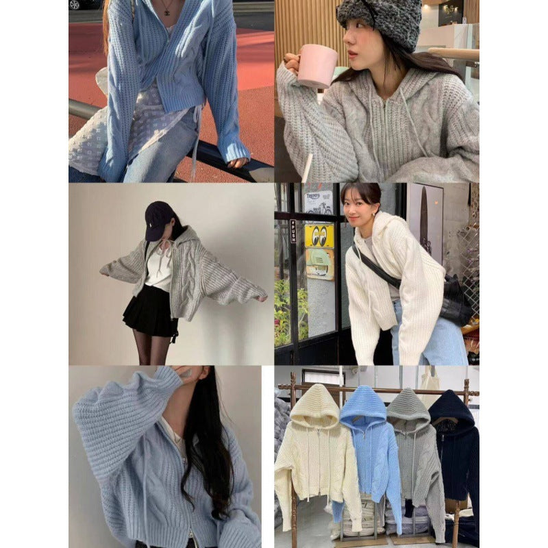 Loose And Idle Twist Hooded Double-headed Zipper Design Sweater Cardigan Coat