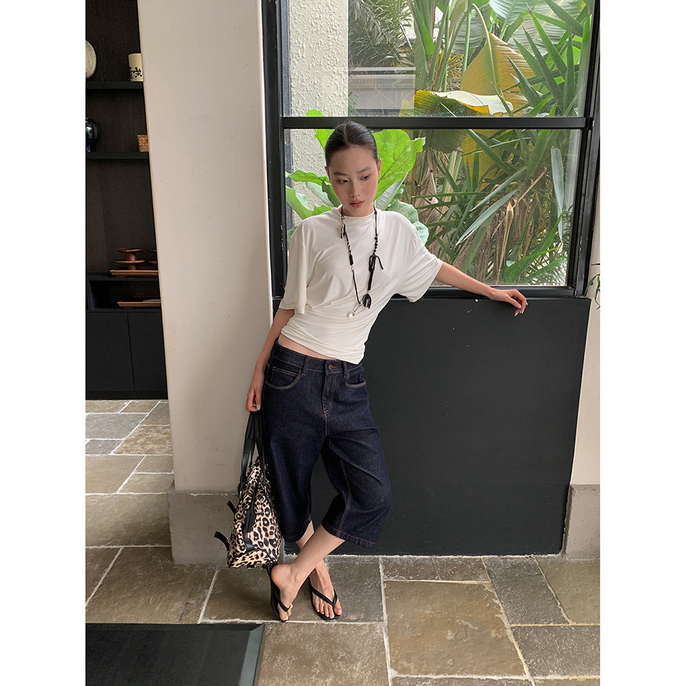 Women's Spring Red Stitching Straight-leg Denim Middle Pants
